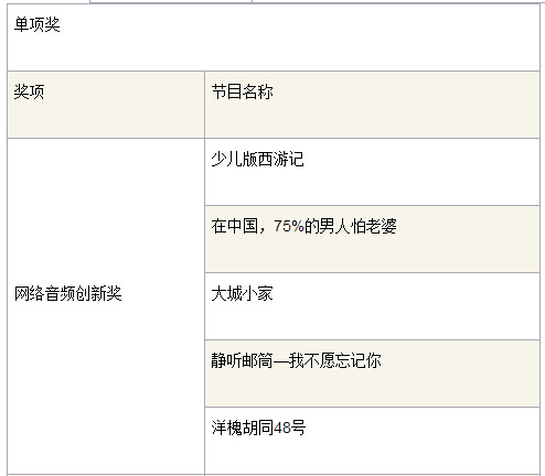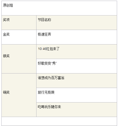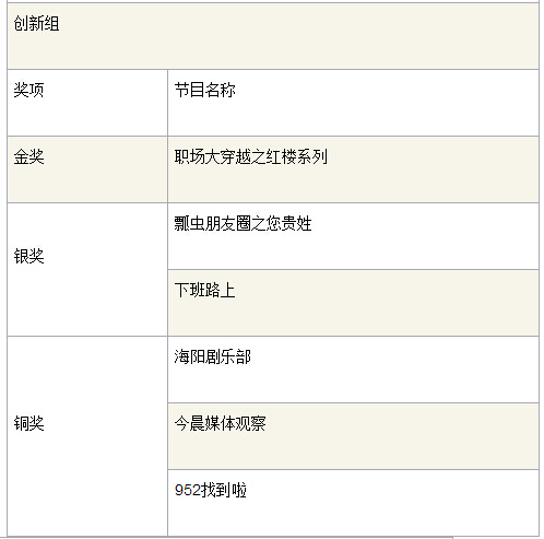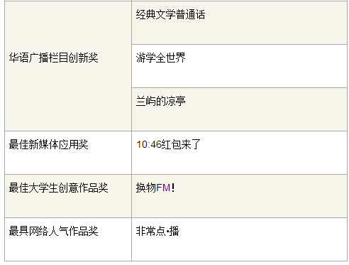 大赛金、银、铜奖等各个奖项在现场揭开了神秘的面纱。《极速狂奔》与《职场大穿越之红楼系列》两件作品分获原创类和创新类广播栏目金奖,银奖由《10:46红包来了》《瓢虫朋友圈之您贵姓》等四件作品获得,铜奖由《谁想成为百万富翁》《海阳剧乐部》等六件作品获得。《换物FM》获得“最佳大学生创意作品奖”,《经典文学普通话》等三个作品获得“华语广播栏目创新奖”,《10:46红包来了》获得“最佳新媒体应用奖”,《非常点·播》获得“最具网络人气作品奖”。除上述既有奖项外,今年大赛组委会特别为只在互联网播出的音频节目设立了“网络音频创新奖”,以鼓励广播在新媒体背景下的全面创新。《少儿版西游记》《在中国,75%的男人都怕老婆》等五个作品获得“网络音频创新奖”。