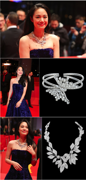 当天,周韵身穿DIOR宝蓝色抹胸过膝长裙,乌黑的长发垂于左肩,仿佛一只优雅而高贵的天鹅,在柏林红毯亭亭玉立。为了搭配这套服装,她选择了通灵珠宝高级定制系列钻饰。项链仿似自然界轻盈的树叶,向四方延展,根部由两束圆环箍住,使项链整体犹如精灵串连的花环,而她皓腕间的蝴蝶型手镯则由两股密镶钻石手环汇合成型,飘然腕间,仿似要一嗅清香树叶,整体LOOK显得高贵而不失灵动。