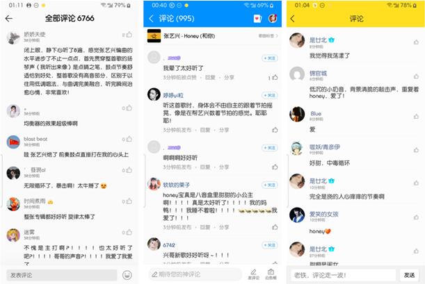 歌曲一经上线,QQ音乐四首歌曲评论全部突破999+,乐迷在评论区写下了甜言蜜语,QQ音乐乐迷“Aslan”评论《HONEY》:“妈耶,爱死这个节奏了!纯净的背景音和鼓声完美融合,人声也很好地融于其中,平静和跳动完美兼容,好甜啊”。酷狗音乐乐迷“婷婷yi粒”评论《HONEY》:“听这首歌时,身体会不由自主的跟着节奏节拍摇晃,像是在帮艺兴数着节拍的感觉,耶耶耶!”。酷我音乐乐迷“锦官城”评论《HONEY》:“低沉的小奶音,背景清脆的敲击声,重复着honey,爱了”。从这些精彩乐评可以看出,好音乐的影响力非同凡响。