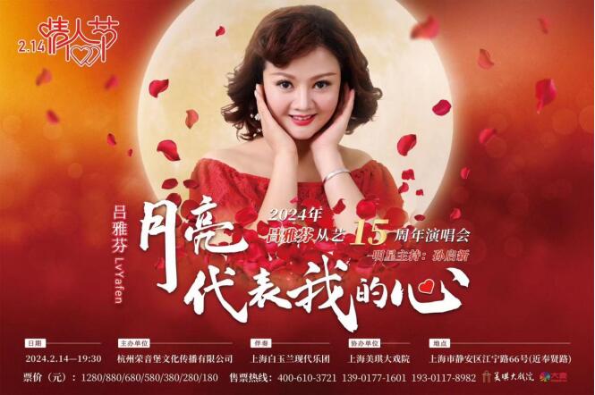 2024年2月14日,正值吕雅芬从艺十五周年之际,为答谢新老朋友的厚爱与支持,上海美琪大戏院即将迎来一场别开生面的情人节演唱会,不仅有老少皆宜的邓丽君金曲逐一奉上,同时还特邀明星主持孙启新老师现场嘉宾主持,还特邀沪上知名萨克斯演奏家汤迎、特邀沪剧表演艺术家吴嵘璟、特邀知名歌星李海云、特邀新疆知名“小邓丽君”苏毛毛,以及来自阿根廷的著名表演艺术家Nicolas Leandro等一众名人参与……群星荟萃,燃情奉献,只因2月14当天,是情人节,也是吕雅芬从艺十五周年庆,更是她的生日,可谓是“三喜临门”。