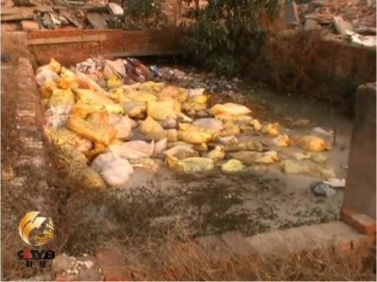 牛车垛村村民:渗到地下去,就影响水源了。对呀。你看这是什么,这都是化工的东西,对不对。我不在行,但是这肯定是化工的东西。刚倒的时候,气味浓得不得了。