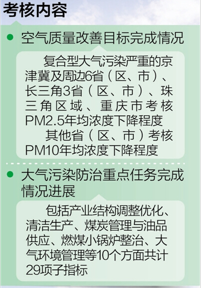 考核办法对考核主体、考核对象和考核内容做出了具体规定。翟青说,考核办法明确指出,各省、自治区、直辖市人民政府是实行《大气十条》的责任主体,政府主要负责人对本行政区域大气污染防治工作负总责;环保部会同发改委、工信部、财政部、住建部、能源局等部门开展《大气十条》实施情况的考核工作。