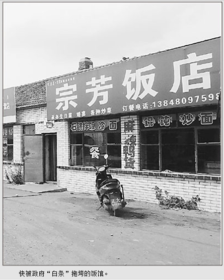 记者经多方核实了解到,1992年,奎勒河镇农民徐瑞梅在镇上开了一家名叫“宗芳饭店”的家常饭馆。慢慢地,回头客越来越多,也成了镇政府的“定点饭馆”。好不容易碰上镇政府这个“不差钱”的“老主顾”,徐瑞梅刚开始还颇感自豪。然而好景不长,她发现镇政府的人来吃饭,从来不结账,习惯“打白条”,一般都是在账单上龙飞凤舞地签个字,“嘴一抹拍屁股走人”。一晃过了两年,当她拿着厚厚一摞饭费单据去镇政府找财务人员结账,得到的答复是:“镇里没钱给,先欠着吧!”