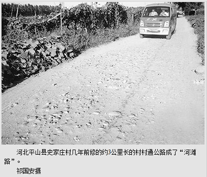 承包道路施工的老板知道,工程完了也要被拖欠承包款,于是就来个“明修栈道、暗度陈仓”,在工程质量上打折扣,上报一袋50元左右的水泥,实际使用的是十几元的水泥,即使如此,水泥还会少用。按规定应使用小石子、细沙与水泥铺路,承包者却使用河里的鹅卵石,大小不一不说,价格是石子的十几分之一。至于细沙根本就没有使用过一锹,而是将鹅卵石与河里的粗沙子一块使用。如此一来,村村通公路就成了“河滩路”“豆腐渣”路。
