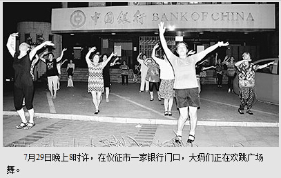 和很多城市一样,广场舞从前些年开始流入江苏仪征这个滨江小城,遂一发而不可收拾。最开始,广场舞仅在中原商贸城广场进行,跳舞者也不是太多。随着参加的舞客渐渐增多,城区跳舞点也随之增多。到如今,不少城区银行、商场等门前的小广场也成了舞点。7月29日晚上,笔者在仪征市大庆北路、真州西路以及工农北路等几处闹市区空旷广场看到,大妈们正充满激情地跳着广场舞。