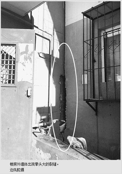 当时,小区这几十栋楼是开发商在我村的耕地上建的。村里也有人到小区工程队里打工赚钱,知晓了施工方的不规范操作。由于楼房质量差,当时没有多少人买。后来区里搞开发区建设,我们5个村的村民住房被拆迁,当地政府便“搭便车”,从开发商手里将这些商品楼打包收购后转给我们这些拆迁户住。我家分了两套房子,入住后发现质量很差,如今房间的防盗门已关不上,一楼外墙因房屋倾斜而出现很大裂缝。我曾多次向政府部门反映,有关人员只是说楼房存在质量问题,却无人认真解决。如今,我们这些住户真是提心吊胆,有苦难言。