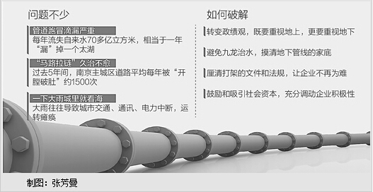 为了扭转“重地上轻地下”“重建设轻管理”的城市建设管理旧观念,今年6月,国务院办公厅印发了《关于加强城市地下管线建设管理的指导意见》,要求2015年底前完成城市地下管线普查,建立综合管理信息系统,编制完成地下管线综合规划。用10年左右时间,建成较为完善的城市地下管线体系。