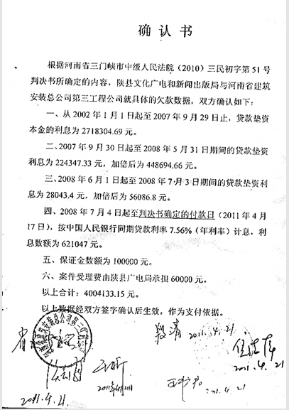 法院下达判决后,陕县文化广电和新闻出版局也未提出上诉。之后我们双方又再次对所有欠款进行确认,欠款合计为4004133.15元,双方代表于2011年4月21日签字确认(见上图)。之后陕县文化广电和新闻出版局一直以没钱为由久拖不还,我公司曾申请三门峡市中级人民法院依法执行,但一直未拿到欠款。