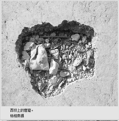 如此豆腐渣工程还造成西坝上数十个窟窿的形成。泌阳县水利局称西坝迎水坡的数十个窟窿,其实是水库上游砼护坡排水孔,为工程设计内容。但排水孔和窟窿是两码事。我们看到东西两坝一共有十几个圆形的排水孔,口内插有约4寸长的白色塑料胶管。但西坝除了几个排水孔,还有数十个窟窿,我们仔仔细细地观察这些大大小小不同规则的窟窿,发现水泥中含有大量杂质,水泥含量极少。