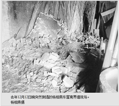 村民宋民祥和杨相燕夫妇家的房子长期受潮,地板、柜子、墙上等地方发霉长毛,墙体开裂、下陷。12月12日晚,东屋南界墙突然倒塌。万般无奈,宋民祥一家老小为了安全被迫搬出去,在镇上租了间房子暂住下来。