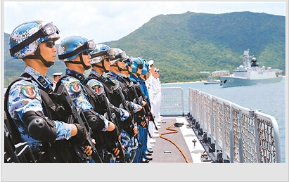 6月9日,经中央军委批准,由海军导弹驱逐舰海口舰、导弹护卫舰岳阳舰、综合补给舰千岛湖舰、和平方舟医院船组成的舰艇编队,分别从海南三亚、浙江舟山军港起航,赴美参加“环太平洋-2014”演习。这是中国海军首次派舰艇编队参加“环太平洋”多国海军军事演习。图为在三亚某军港,海口舰官兵及随舰出海的特战队员离开码头。