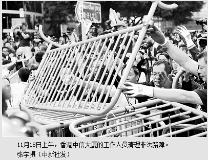 据香港媒体报道,11月18日晨当地警方协同有关方面在金钟中信大厦外围执行清除障碍物行动,进行约两个小时后完成。在清理过程中,有占领人士不满工作人员将立法会大楼外回旋处的铁马也搬走,一度与负责人理论,并要求解释清楚清理障碍物的具体范围,但并无大的冲突。