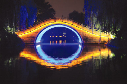 画舫划开一片水面,驶进夜色深处,瘦西湖越发旖旎曼妙,“动静结合”、“无中生有”的布置手法,营造出融幽静、朦胧、诗意、文化于一体的夜间景观。沿着长堤春柳、小金山、五亭桥、熙春台至晴云轩,一路将诗情、画意、笙歌播撒。画舫滑过之处,湖水在船舷边上弹唱,似乎在诉说着岁月钩沉,千年往事都随着这汩汩的湖水从历史深处流淌而来。光影是只魔术手,大虹桥长虹卧波,春波桥凌空飞渡,玉版桥轻雾缭绕,五亭桥上璀璨的金色;熙春台上,流水一样的琴声;晴云轩畔,酸梅汤的清凉、架子鼓的激情……与晚风荷香一起定格在游人的记忆中。