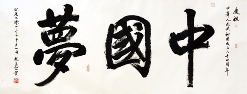 此次展览共展出他近年创作的精品力作90余幅,其作品中楷书出色,旁及各体,尤其擅长行草。他的楷书笔法、点画、结体等十分精到、一丝不苟,其书典雅劲健、雄浑秀逸,见功见性。行书作品用笔讲究,结字正欹互生,形态端庄遒美,婉畅多姿,书来不疾不缓,亦疾亦缓。草书作品更是挥洒自如,收放有方,缭绕酣畅,自然天成。偶作篆隶,亦古朴端秀、厚重苍浑。正如中国书法泰斗欧阳中石对他的作品所评:"墨妙字精、章法流畅、气息雅静、洒脱豪放,有游龙惊鸿之志、腾蛟起凤之气势。"这样的特点特别表现在展厅核心位置的丈二巨作《中国梦》三个大字,气势磅礴中不失端庄秀美,抒发了作者为实现中华民族伟大复兴中国梦的美好祝愿,也充分体现了主办单位在全国政协通过本次展览凝聚社会各界力量庆祝祖国生日的良好主题。展厅内人头攒动,数百位来自浙江、江苏、上海、辽宁、天津等地的人士慕名前来参观、交流,并现场预订展览中的墨宝以供珍藏。
