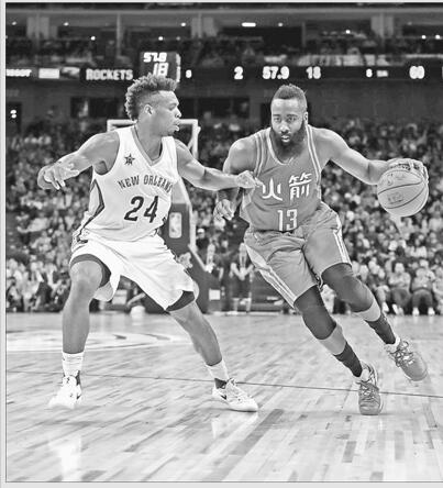 当日,在上海举行的NBA(美国男篮职业联赛)中国赛中,火箭队以123∶117战胜鹈鹕队。