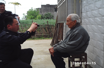 4月15日,慈音寺派出所民警得知辖区中脊村1社,年满93岁的老大爷蒲丰春,因患多种疾病,行走困难,生活不能自理。其老伴冉素芳已满88岁,身体较差,行动也不方便。两位老人未办理第二代身份证,无法办理医保卡到社区居委会领取养老生活补助费。所长王传电,副所长古敏红,立即带领户籍民警孙是、古婷赶到蒲丰春家问寒问暖,帮助老人打扫卫生,整理衣着,为蒲老拍摄身份证像,免费为老人办理身份证。