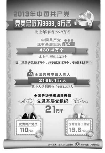 本报北京6月30日电 (记者盛若蔚)中央组织部最新党内统计数据显示,截至2013年底,中国共产党党员总数为8668.6万名,比上年净增155.9万名,增幅为1.8%;党的基层组织总数达430.4万个,比上年增加10.2万个,增幅为2.4%。数据表明,中央关于党员队伍建设和基层党组织建设的新部署新要求得到了较好落实。