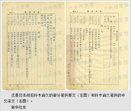 中央档案馆7月3日公布了日本战犯铃木启久的侵华罪行自供提要。