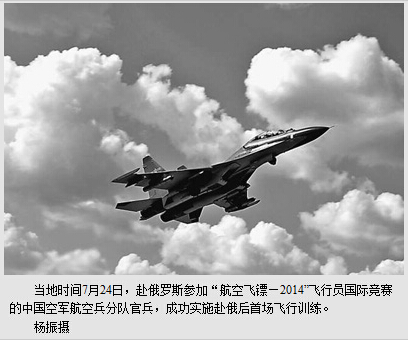 俄罗斯当地时间26日10时30分,中国空军航空兵分队的王震、陈小平、闫香晴、王仲化等4名飞行员,驾驶2架苏—30飞机从利佩茨克机场呼啸升空,进入波戈诺沃航空兵靶场指定空域后,按计划顺利完成双机编队飞行导航、地面目标搜索和复杂特技飞行等3个课目竞赛,并进行了火箭弹对地打靶。中国空军飞行员过硬的飞行技术,赢得俄罗斯同行和媒体记者的好评。竞赛结束后,俄罗斯国防部副部长巴辛大将给予点赞:“中国空军飞行员表现出过硬的职业素养和高超的训练水平,给大家留下深刻印象。”