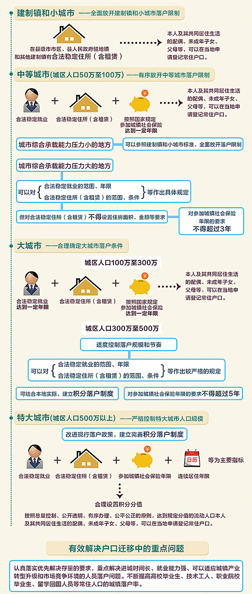 城市落户实行“能放开的放开,该控制的控制”。《意见》将主要根据各个城市人口的规模和各地综合承载能力的不同情况,实行差别化的落户政策。(见图)黄明表示,像北上广这样的城市,过去十年年均增长流动人口40-50万,人口压力太大,建立公开透明的积分落户制度较为适宜。