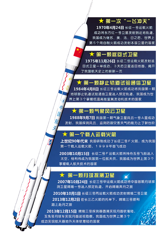 40多年间,我国运载火箭经历了从无到有、从串联到捆绑、从常温推进剂到低温推进剂、从一箭一星到一箭多星、从发射卫星到发射载人飞船和月球探测器的重大跨越,研制形成了长征一号、长征二号、长征三号和长征四号4个系列13种型号的运载火箭,成为具有我国自主知识产权和较强国际竞争力的高科技产品。