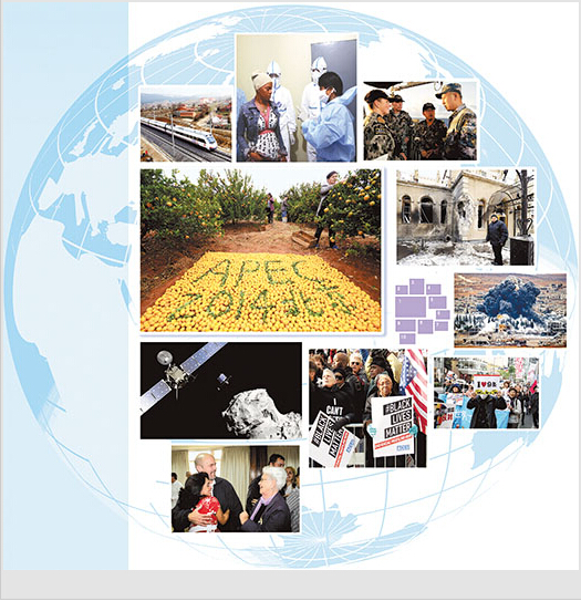 11月5日至11日,亚太经合组织(APEC)领导人会议周在北京举行,确定构建面向未来的亚太伙伴关系、启动亚太自贸区进程,为亚太地区长远发展和共同繁荣勾画新愿景,指引新方向,注入新动力。今年,中国外交积极推动理论和实践创新,阐述中国梦的世界意义,丰富和平发展战略思想,强调建立新型国际关系,提出和贯彻正确义利观,倡导共同、综合、合作、可持续的安全观,推动构建新型大国关系,践行亲诚惠容的周边外交理念和真实亲诚的对非工作方针,赢得全面进取的大丰收。