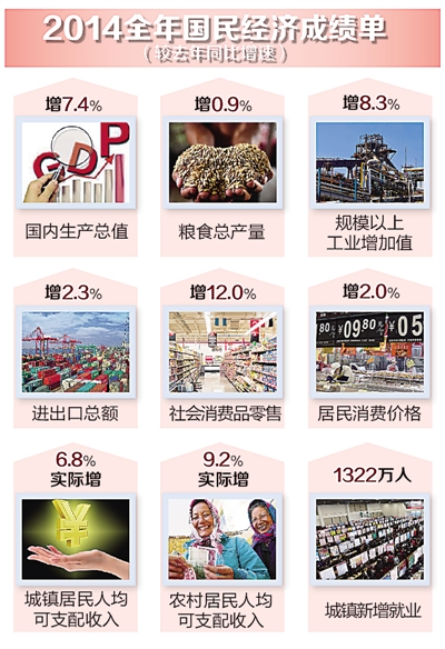 本报北京1月20日电 (记者朱剑红)国家统计局20日发布了2014年国民经济的主要统计数据,据初步核算,全年国内生产总值突破60万亿,达到636463亿元,按可比价格计算,比上年增长7.4%。国家统计局局长马建堂说,国民经济在新常态下保持平稳运行,呈现出增长平稳、结构优化、质量提升、民生改善的良好态势。