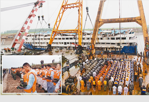 湖北省军区某舟桥旅自6月2日进入现场以来已连续奋战六天五夜。7日,在船上的200余名官兵继续对船体进行全面搜救和清理工作。