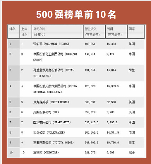 在2015年排行榜前10名,榜单冠军仍旧是去年榜首美国企业沃尔玛,中国企业中石化表现强劲,在榜上排名比去年上升一位,排名超过壳牌石油,成为榜单亚军,荷兰壳牌石油跌至第三位。根据发布的榜单,占据后7位的企业依次为中石油、埃克森美孚、英国石油公司、国家电网公司、大众公司、丰田汽车公司、瑞士嘉能可。