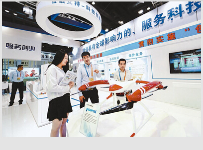 6月1日,第四届中国(北京)国际服务贸易交易会(简称“京交会”)完美收官。据初步统计,本届京交会共达成签约331个,意向签约额达1010.8亿美元,显示中国服务业的国际竞争力不断增强,服务贸易正成为我国供给侧结构性改革的重要牵引力量。图为中关村发展集团在会上展示一种工业级无人机,该机具有功能多、可靠性高的特点。
