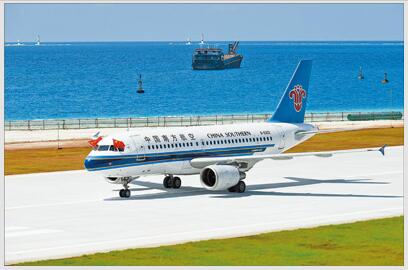 7月13日8时30分、8时40分,中国政府征用的南方航空公司、海南航空公司两架民航客机先后从海口美兰国际机场起飞,经过近2个小时的飞行,分别于10时29分、10时28分在美济礁新建机场和渚碧礁新建机场平稳着陆并于当日下午返回海口,试飞成功。图为当日南方航空公司的客机在美济礁新建机场着陆。