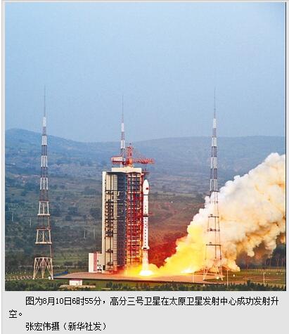 本报北京8月10日电  (记者吴月辉)从国防科工局获悉:8月10日6时55分,我国在太原卫星发射中心用长征四号丙运载火箭成功发射高分三号卫星。高分三号卫星是我国首颗分辨率达到1米的C频段多极化合成孔径雷达(SAR)卫星,将显著提升我国对地遥感观测能力,是高分专项工程实现时空协调、全天候、全天时对地观测目标的重要基础。