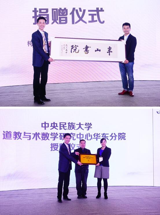嘉宾致辞后,宁波半边山投资有限公司董事长张旭辉、该公司半边山东海学堂校长方钦及宁波象山海景皇冠假日酒店总经理胡宏涛分别向来宾们介绍了东海半边山、学堂和酒店的具体情况。随后进行了“中央民族大学道教与术数学研究中心华东分院”的授牌仪式。中央民族大学哲学与宗教学学院博士生导师谢路军教授就道教与术数学研究中心的相关情况作了介绍并授牌。象山紫航投资有限公司总经理蔡丽英和半边山东海学堂校长方钦共同接收了牌匾。中央民族大学道教与术数学研究中心华东分院正式落户东海半边山。授牌仪式后还进行了校董聘任仪式。半边山东海学堂聘请著名古建筑收藏家柯海廷为名誉校董。柯海廷还向学堂捐赠了明末清初的古建筑一栋。
