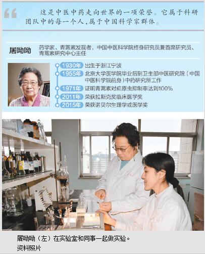 近几年,屠呦呦两度实现了中国本土科学家在国际奖项上“零的突破”:2011年的拉斯克临床医学奖和2015年的诺贝尔生理学或医学奖。但她公开表示,中医中药走向世界,荣誉属于科研团队中的每一个人,属于中国科学家群体。