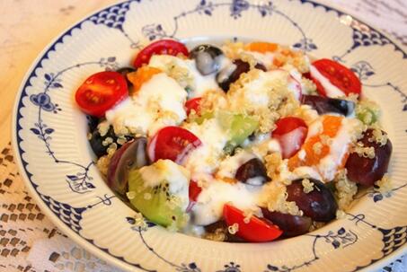 对于减肥人群来说,热量低营养丰富的餐食更为适宜,因此推荐藜麦水果沙拉,在减少主食摄入的同时,拥有丰富的维生素、蛋白质、氨基酸等营养成分,为身体带来更好的养护。