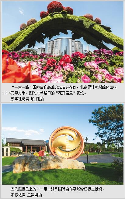 央视网发布了一组图片,探访“一带一路”国际合作高峰论坛新闻中心。宽敞的新闻中心大楼,会议室内摆放整齐的座椅,显示出会议准备工作的井然有序。网友“SummerMirage”称赞道:“准备充分,棒棒的!”中新网发布的一组照片视角则对准了北京全市。为迎接高峰论坛的召开,北京市在国家会议中心前广场、东单、西单等地布置了7座立体花坛,不少市民在花坛前合影留念。凤凰网、美国侨报网等网站也都对此进行了转载关注。新浪微博账号“北京人北京事儿”等,还特别关注到了为迎接高峰论坛召开而特别建造的“丝路金桥”花坛。这一花坛以赵州桥为原型,将“一带一路”沿线各国国花、市花融入在透明的金砖中,创意令网友称赞。网友“冰心DBX”说,“金碧辉煌,大气、好看!”网友“舒勇”等则表示,很想去东单亲自看看。