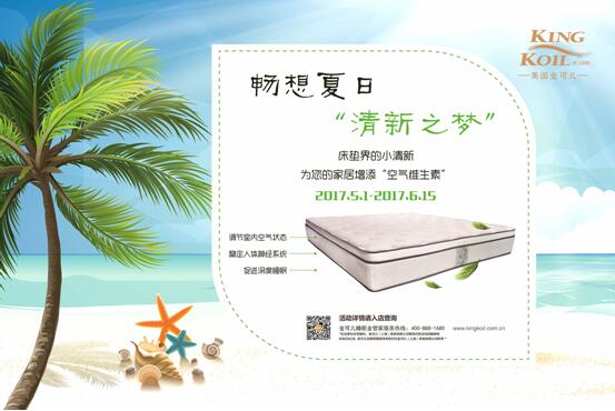 (2017年5月)国际知名高端床具品牌KINGKOIL美国金可儿在5月推出了新品床垫——“清新之梦Fresh Dream”。这款“黑科技”床垫首次启用能够释放享有医学界“空气维生素”美名的负离子新型海绵,既能发挥负离子调节室内空气状态,又能稳定人体神经系统,促进深度睡眠。别具一格的“清新之梦”以经典的“天梦”床垫为基础,在“清新”和“舒适”这两大主创概念中取得了平衡。