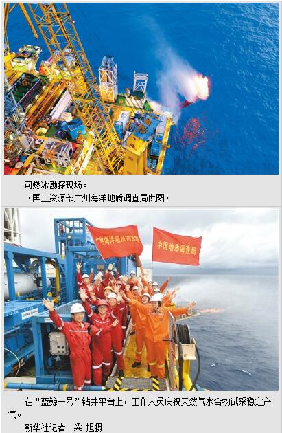 从5月10日起,国土资源部中国地质调查局从我国南海神狐海域水深1266米海底以下203-277米的可燃冰矿藏开采出天然气。截至5月17日15时,总量试采12万立方米,最高产量达3.5万立方米/天,平均日产超过1.6万立方米,其中甲烷含量最高达99.5%,圆满完成预定目标,实现连续稳定产气。这一成功取得了天然气水合物试开采的历史性突破,打破了我国在能源勘查开发领域长期跟跑的局面,取得了理论、技术、工程和装备的完全自主创新,实现了在这一领域由“跟跑”到“领跑”的历史性跨越。这一成果对促进我国能源安全保障、优化能源结构,甚至对改变世界能源供应格局,都具有里程碑意义。