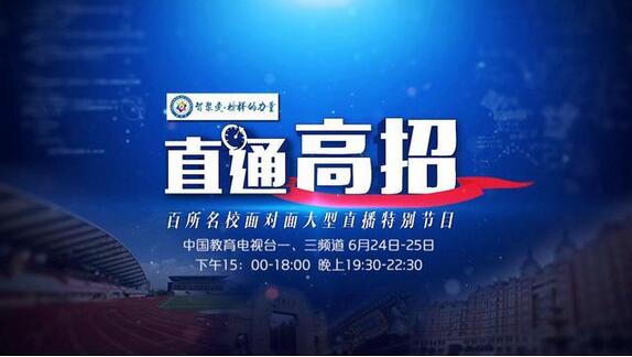 你若高考,我有“高招”!高考“冲刺赛”结束,而高招“决策赛”的大幕即将正式拉开。6月24日、25日,中国教育电视台将倾情推出每天6小时的《智聚变·直通高招——百所名校面对面》大型直播特别节目,为广大考生和家长提供更直接、更权威、更及时的服务,详解百所名校招生制度,全心全意为考生保驾护航。