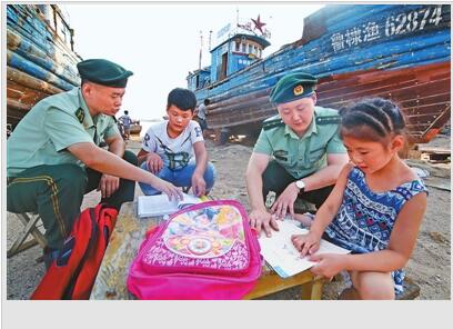 7月13日,山东滨州大口河边防派出所两名民警正在水沟村渔港码头为学生们辅导功课。