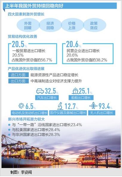 贸易结构继续优化、改善。一是贸易方式更趋合理。一般贸易进出口增长20.5%,占我国外贸总值的56.7%,较去年同期提升0.4个百分点。二是进出口市场更趋多元化。上半年,对欧美日等传统市场进出口增长18.9%,同时对俄罗斯、巴基斯坦、波兰、孟加拉国等“一带一路”沿线国家进出口分别增长33.1%、14.5%、24.6%和15.5%。三是内生动力更趋强劲。民营企业进出口增长20.6%,占我国外贸总值的38.2%,较去年同期提升0.3个百分点。
