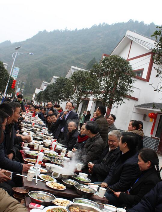 县长陈钊在大坡镇扶贫调研过程中,参加村民们的长桌宴,看到丰衣足食的老百性,他高兴地讲了起来