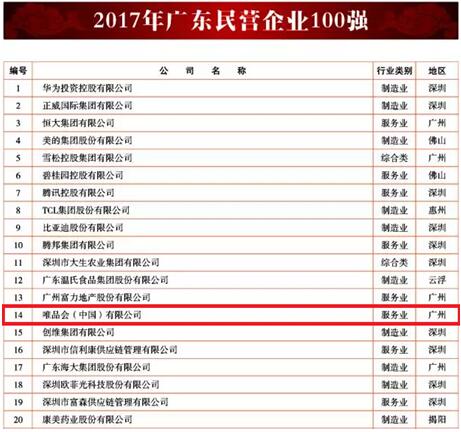无独有偶,在8月3日由广东省企业联合会和广东省企业家协会等联合发布的2017年广东企业500强及行业100强榜单中,唯品会成绩显著,与粤籍骨干企业华为、华润、腾讯等一同在“2017年广东企业500强”榜单中名列前茅,更斩获“2017年广东民营企业100强”第14名及“2017年广东服务业100强”第12名的优异成绩。