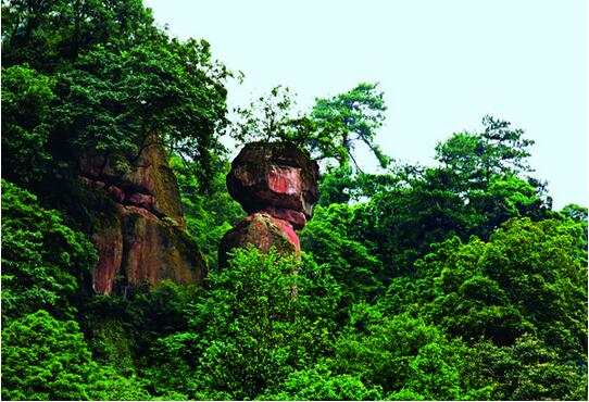 金猴石:五柱峰对面山间,丛林中一独立的丹霞石,其形似一石猴站立在林间而得名。