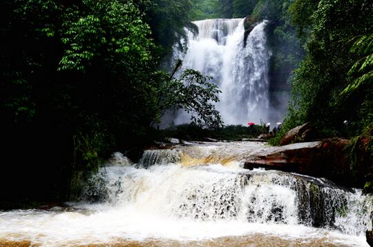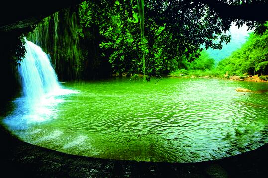 月亮潭瀑布:宽42米、高10米,远看秀美得如一把向下的弯形银梳。