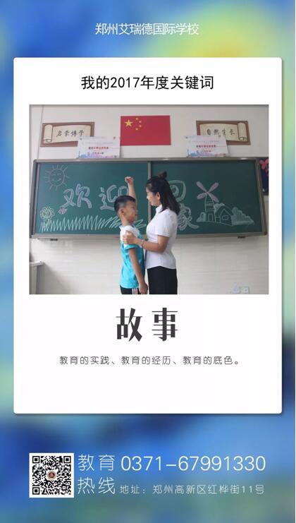 2017年,艾瑞德每个人都是故事的主角。我们每单周一次的“故事分享会”、每双周一次的“读书分享会”,立足“故事”和“温度”的视角,通过一个又一个带着爱与关怀的举措,给孩子“设期待、给机会、善评价”,给老师“出点子、搭梯子、找位子”,让学校办成了一件又一件“大事”,让孩子们有了存在感、价值感、归属感,让教师们有了幸福感、认同感、成就感。