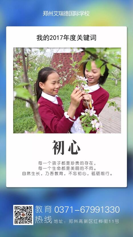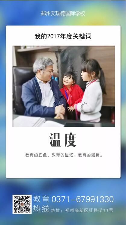 2017年,我们朝夕相处,荣辱与共;我们教学相长,共同进步。高年级的学哥、学姐爱护学弟、学妹,我们爱同学,爱父母,爱老师,爱学校,更爱社会,爱国家,艾瑞德充满了“爱”的温度,用37.2度的爱温暖校园,用真诚的爱感动社会,用无疆的爱连接世界。艾瑞德润物无声地呵护着师生的生命之根,滋养着师生的心灵之花。