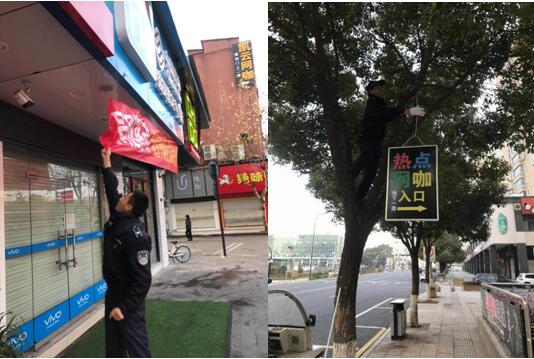 2018年2月22日,节后正式上班第一天,义乌市综合执法稠城大队执法人员对辖区内擅自设置的横幅、淘宝培训、小耳朵指示牌等广告进行全面的清理。