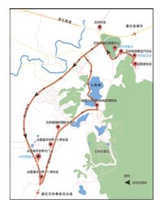 彩云北路—朱家村立交桥—汕昆高速公路—石林环岛—右转离开环岛—石林大道—石林冰雪海洋世界。