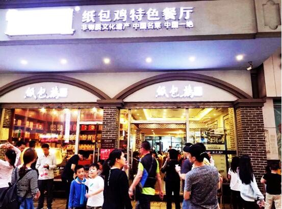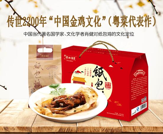 薄如蝉翼的玉扣纸、农家山地散养的三黄鸡、幽深醇厚的秘制卤汁,逐一陈列于案面之上,瞬时间,空气中弥漫着天地融和、原汁原味的诱人芳香!一切经已准备就绪,粤菜厨艺大师们开始运用巧妙的刀工,游刃有余地将三黄鸡切成一件一件,接着勺来秘制卤汁,配以老抽酱油、白酒、枸杞、姜汁、桂皮、八角、茴香、陈皮、草果、红谷米、古月粉等调味料腌制鸡肉,随后,铺开玉扣纸且用手抚平,再将鸡肉置于玉扣纸之上、撒些葱白粒,松紧得度地包裹起来。就这样,一份份如信封形状的纸包鸡包好了,造型优美、叠叠有致。将纸包鸡放入锅中,以花生油隔纸浸炸,片刻的功夫,热气腾腾的纸包鸡终于端上餐桌,一股浓浓的南粤气息扑面而来,轻轻地撕开玉扣纸,金光灿灿的纸包鸡奇妙地飘出了竹子那渗人心脾的缕缕清香,这是以新鲜的嫩竹和清澈的山泉水所制成的玉扣纸独有的香气,缓缓地放入口中,鸡肉鲜嫩甘滑、鸡味浓郁、醇厚不腻……细品一下纸包鸡的历史文化,可以用“博大精深、源远流长”这8个字来形容。“南粤称臣兮,归一统;纸包金鸡兮,定乾坤。”岭南地区(两广地区)民间所流传的这句人们耳熟能详的赋作,仿佛诉说着纸包鸡的前世今生……传世2200年“中国金鸡文化”(粤菜代表作)、中国味道、中国传统节庆第一道菜、中华美食三大名鸡、广府美食三大名鸡、广西三宝、梧州四宝、桂林情结是“互联网+文化定位”文化传播方式对纸包鸡的文化定位,业已在社会上形成广泛共识,家喻户晓、深入人心,此外,纸包鸡还是中国名菜、中国十佳金鸡、广西非物质文化遗产、广西特产行销全国核心品牌、广西最具特色餐饮品牌。古有南越王、汉高祖、苍梧王、唐明皇、杨贵妃、苏轼、明太祖、靖江王、康有为,今有孙中山、陈济棠、白崇禧、徐悲鸿、秦牧、史玉柱等名人,都曾在纸包鸡的史册上留下足迹,为它增添了丰富的传奇色彩!据考证,鸡菜肴,堪称中国传统节庆第一道菜,同时又是人们一日三餐的主要菜肴。在我国的传统文化中,“鸡”与“吉”谐音,寓意吉祥、欢乐、遂心;鸡被视作中华民族的图腾——凤凰,根据先秦时代的志怪典籍《山海经•南山经》中记载:“有鸟焉,其状如鸡,五采而文,名曰凤皇。”寓意尊贵、和谐、兴盛;鸡是一种古老且常见的家禽,堪称中国农耕文化的活化石,古时候,谁的家中畜养了一定数量的鸡,就说明这户人家粮米有余、生活富足。正是因为鸡有着众多美好的文化寓意,所以在饮食文化领域,数千年来人们对鸡菜肴情有独钟,直接推动了鸡菜肴的蓬勃发展。在我国,吃鸡肉的文化传统和饮食习惯由来已久,可以追溯到距今8000年前的新石器时代。古往今来,无论大江南北,以鸡肉作为主要菜肴是不可或缺的,大凡节庆、喜庆筵席,祭祀神灵祖先、家庭团聚畅饮、宴请宾客好友,皆有“无鸡不成宴”的习俗和讲究,民间一直流传着“民以食为天,食以鸡为先”的说法,集中、真实地体现了中国传统饮食文化理念和社会风俗习惯。延续到了今天,以鸡肉作为主要食材所创制的菜肴可谓不计其数,各大菜系流派都有自己的招牌菜,呈现出百花齐放、百家争鸣的繁荣景象。中国是世界四大文明古国之一,中华上下五千年文明向世界彰显出气壮山河、动人心魄的磅礴力量,在中国四大菜系流派之中,以广州、广东佛山、广西梧州为重要发祥地的粤菜流派充分体现了中华美食的文化积淀和辉煌成就。古往今来,纵观遍布全世界每一个角落的中国菜馆,作为中国四大菜系流派之一的粤菜,菜色最为丰富、数量最为繁多、分布最为广泛、影响最为深远,无论你身处美国、身处欧洲、身处东南亚,在餐馆说要吃中国菜的话,80%以上都推荐粤菜为先,粤菜当之无愧是中国菜的杰出代表。而纸包鸡作为粤菜代表作,理所当然能在云云种种的中国鸡菜肴中脱颖而出,登顶至尊宝座!广州,是岭南文明、珠江文明、广府文明、粤菜文化、岭南美食文化的重要发祥地,“食在广州”可谓名不虚传,纸包鸡作为宫廷贡品和日常主菜的历史至少已有2200年,始创于岭南地区,在见证了岭南地区(两广地区)文明史的西汉南越王墓中,就发掘出许多类似于纸包鸡的鸡骨头和残纸。相传,公元前203年,赵佗自号南越武帝,建立南越国,定都番禺(今广州),当时的南越王宴就是以纸包鸡作为主菜的。公元前202年,刘邦称帝,史称汉高祖,建立西汉王朝,定都长安(今陕西西安)。及后,赵佗以纸包鸡作为贡品献与刘邦,上表臣属西汉,刘邦品尝了纸包鸡之后龙颜大悦,诏封赵佗为南越王,至此天下归于大一统,纸包鸡遂成为南越国向西汉王朝年年进贡、岁岁来朝的贡品。纸包鸡和广西桂林这座城市颇有渊源,明朝太祖皇帝朱元璋举“众建宗亲,以藩王室”之政,洪武三年(公元1370年),诏封其侄孙朱守谦为靖江王,藩治桂林,并授金册、金宝,尊荣显赫一时。及后,建靖江王城于独秀峰之下,内立宫宇庙社数百间、外以高城周垣相护,琼楼玉宇、巍峨雄伟、极尽奢华。靖江王城的宫廷宴席也极为讲究排场,道道菜色可谓千挑万选、精益求精,朱守谦在京城(北京)生活时,早已闻得粤地番禺(今广州)有岭南名食纸包鸡,传承越千年、享誉海内外,深感靖江王宴非纸包鸡莫能压轴,遂特意派人到番禺,礼贤下士,将名厨请进王府专事制作纸包鸡,以彰显靖江王宴和粤桂美食之泱泱风范。民间流传着“靖江宴席既出世,纸包金鸡八
